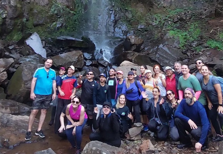 Durante o percurso, os participantes atravessam trechos de mata preservada e áreas naturais praticamente intocadas, até chegar à cachoeira, um dos cenários mais impressionantes da propriedade.