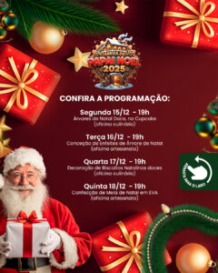 A magia do Natal vai invadir a cidade com uma série de oficinas especiais para as crianças, reunindo criatividade, sabor e muita diversão. As atividades incluem culinária e artesanato, oferecendo experiências encantadoras para toda a família acompanhar.